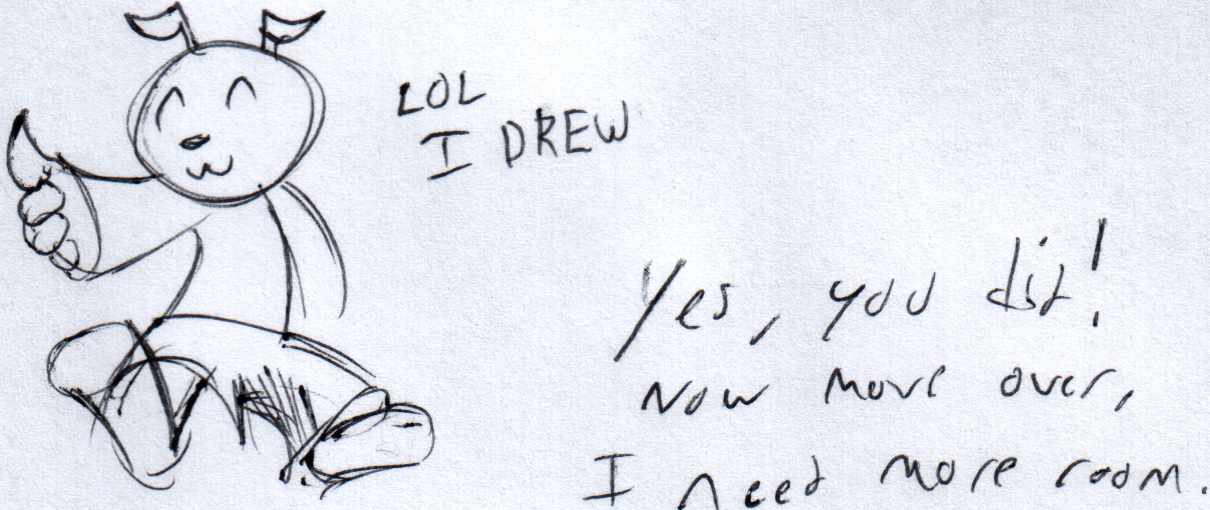 Image Uploader Retl, November 23, 2009; 16:39 Tags :3 author_indifferent ink_sketch silly Source Unknown Locked No Rating Unrated Comments Link to Post BBCode Link Thumb File HTML Link Thumb File Plain Text Link Thumb File